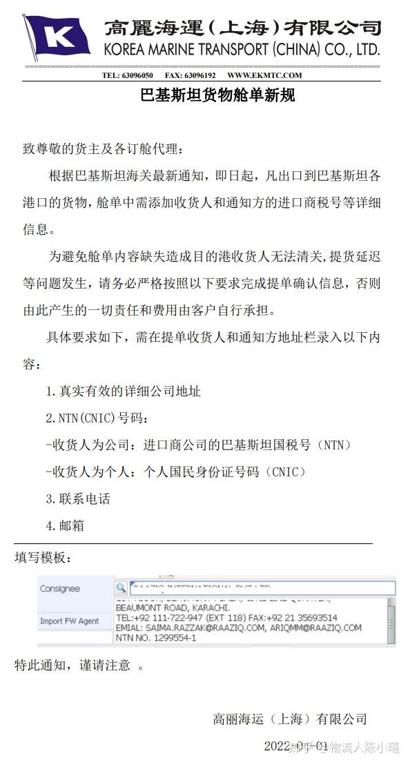 高丽海运日前发布公告称,根据巴基斯坦海关最新通知,自2022年4月1日起,凡出口到巴基斯坦各港口的货物,舱单中需添加收货人和通知方的进口商税号等详细信息。