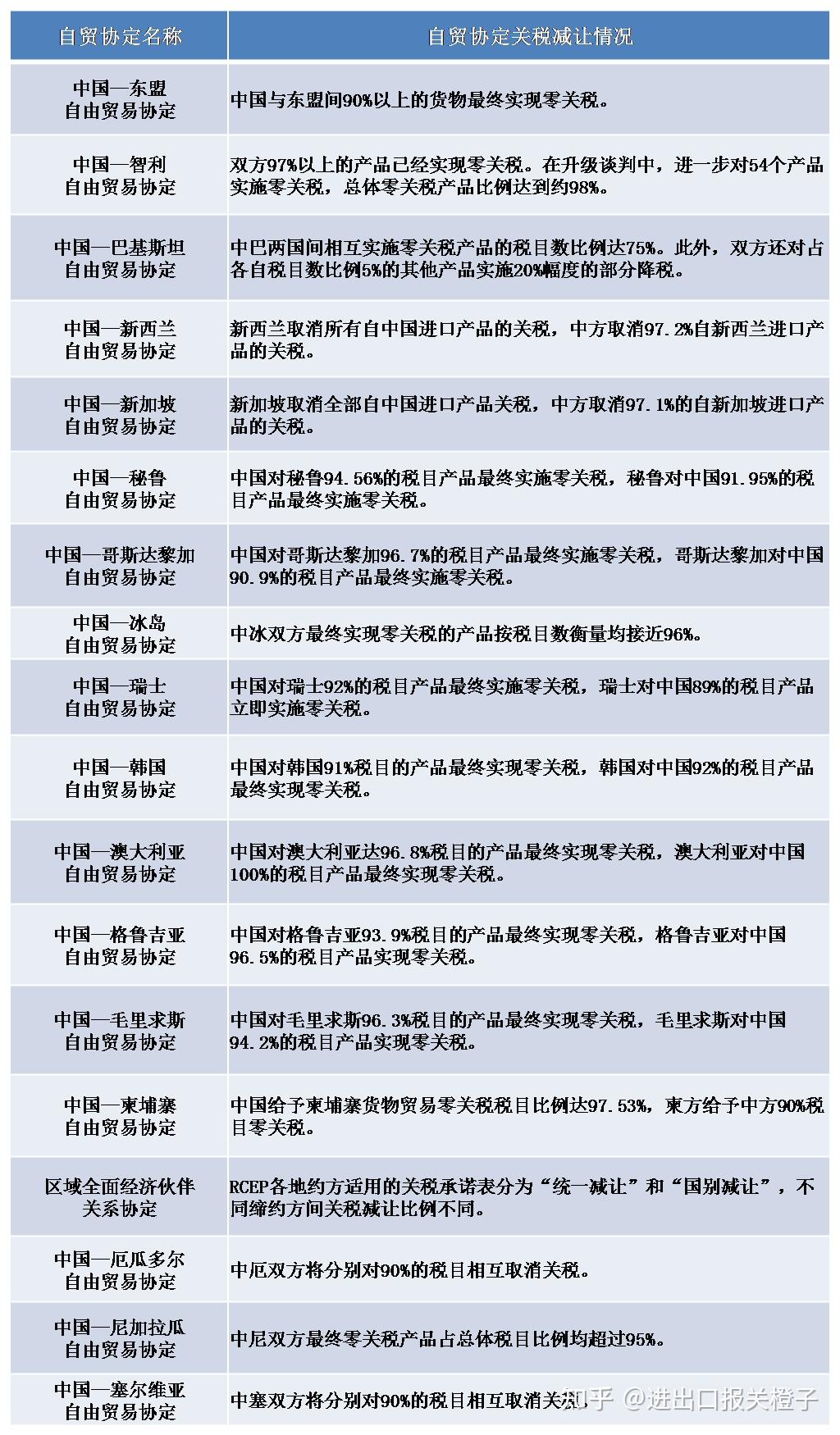 中国与其他国家自贸协定关税优惠政策,依据自由贸易协定,来自协议伙伴国的原产货物可以获得进口关税减让优惠,关税减让概况见下表。