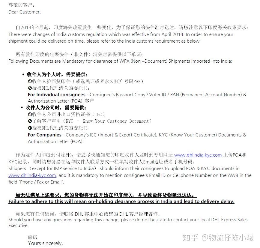 (1)请您尽快通知您的印度收件人及时到专用网址http://www.dhlindia-kyc.com 上传POA、KYC(Know Your Customer Document)等相关记录;
