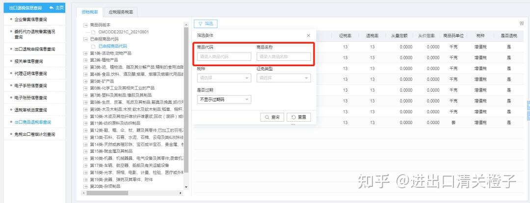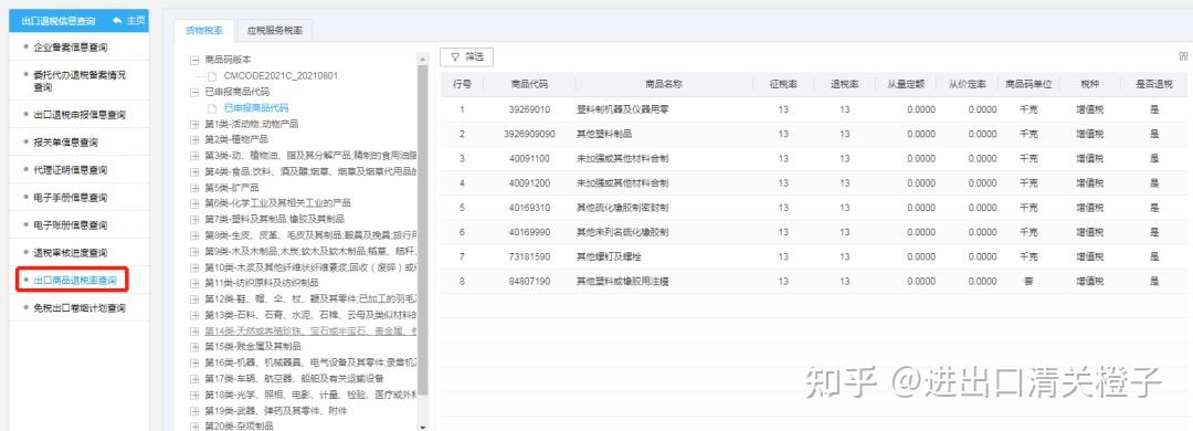 02.在左侧菜单中点击“出口商品退税率查询”,筛选商品名称或商品代码,就可以查询到所查商品的征税率和退税率啦。