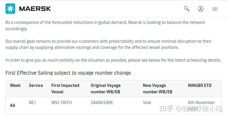 2M联盟的合作伙伴MSC和马士基日前宣布,由于“预计需求的减少”,他们将再次取消从中国首航的AE1/Shogun亚洲-北欧航次,即取消原定于11月6日从宁波港启航的14336标准箱“MSC Faith”轮。