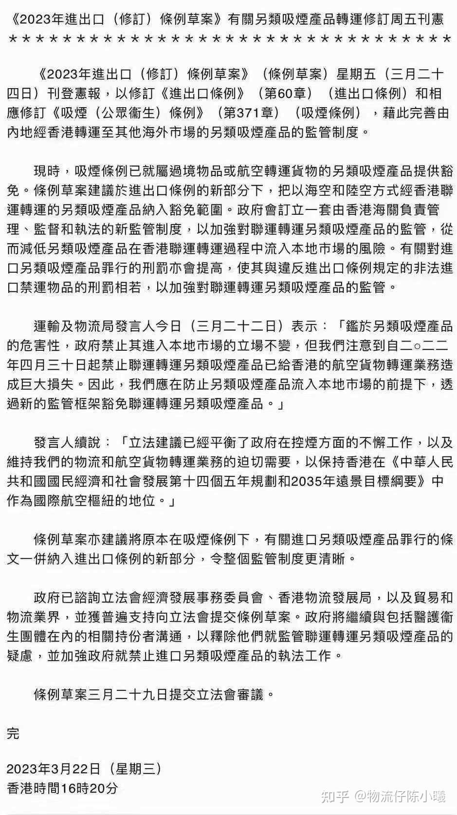 3月22日,香港特别行政区政府表示,本周五(3月24日)将刊宪《2023年进出口(修订)条例草案》,允许以海空和路空方式经香港联运转运另类吸烟产品(电子烟)至海外市场,条例草案会在下周三(3月29日)提交立法会审议。