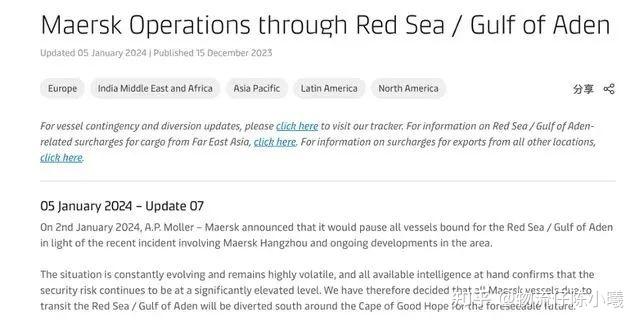 1月5日,马士基宣布,决定在可预见的未来,所有经过红海/亚丁湾的马士基船只都将向南绕过好望角,马士基此次绕航船舶总量将超过170艘。