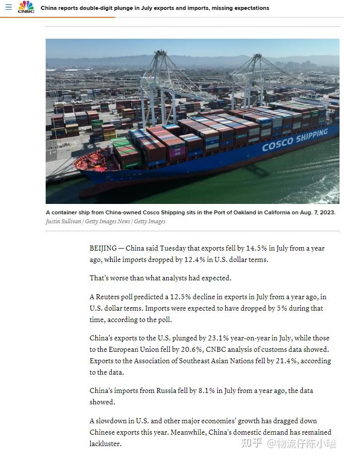 海关总署报道:今年7月份,我国进出口3.46万亿元,下降8.3%;其中,出口2.02万亿元,下降9.2%;进口1.44万亿元,下降6.9%;贸易顺差5757亿元,收窄14.6%
