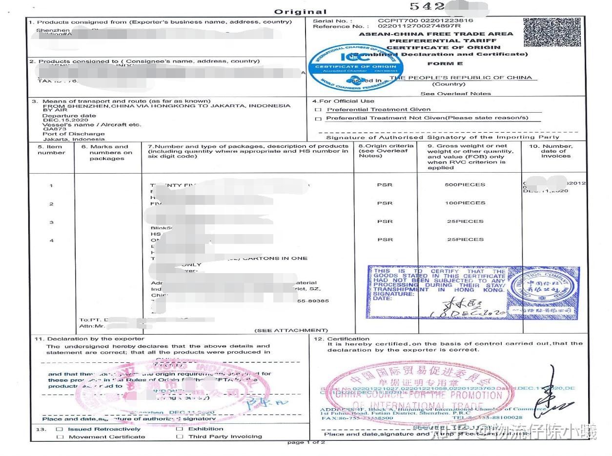 另一种:先出产地证(印尼FE),然后把产地证送到香港做认证证明(加盖中检认证章),这种一般3-4工作日出证。