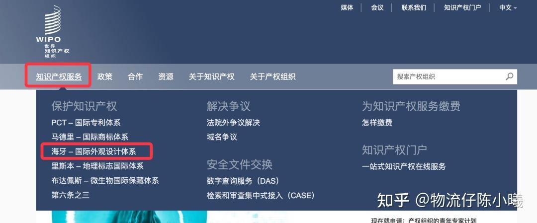 2.点击知识产权服务,选择海牙国际外观专利体系