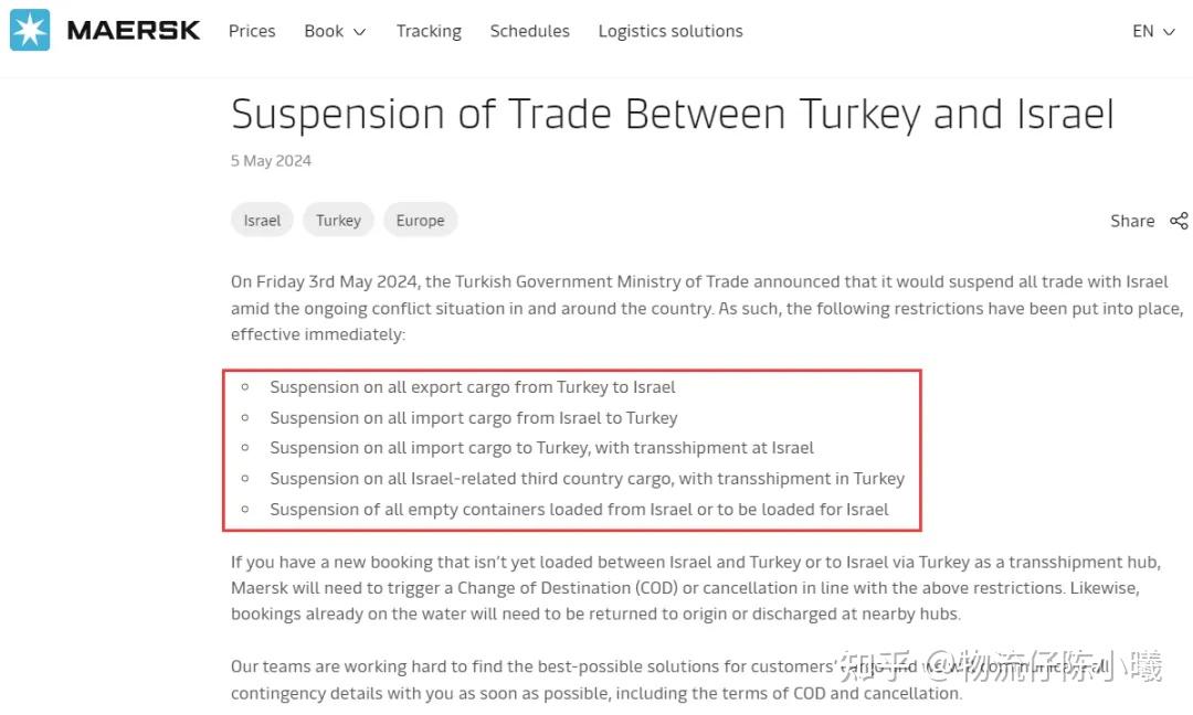 5月5日,马士基官网发布公告,暂停土耳其和以色列之间的所有进出口贸易、以及取消订舱等。