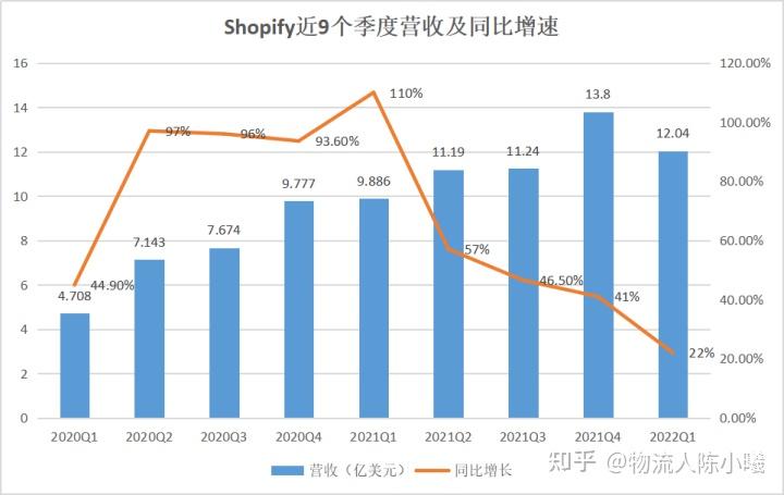 2022年第一季度,随着北美全面放开疫情管控,Shopify面临的店铺数量和商家GMV增长回落的挑战更加明显。该季度中,Shopify总营收为12.04亿美元,不及市场普遍预计的12.4亿美元,同比增长22%;GMV达432亿美元,不及分析师普遍预计的465亿美元,两年期复合增速为57%,同比去年增长16%;虽然营收额创历史新高,但营收增速创下了七年以来的最低记录。